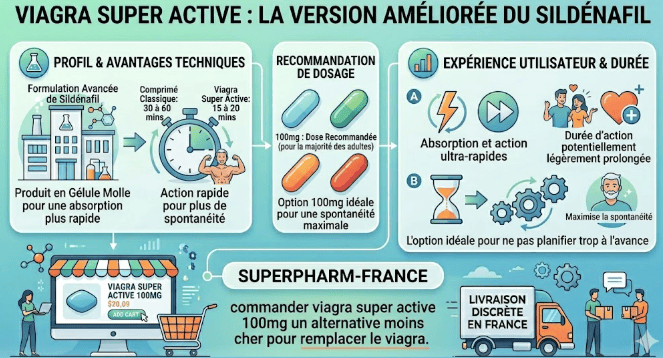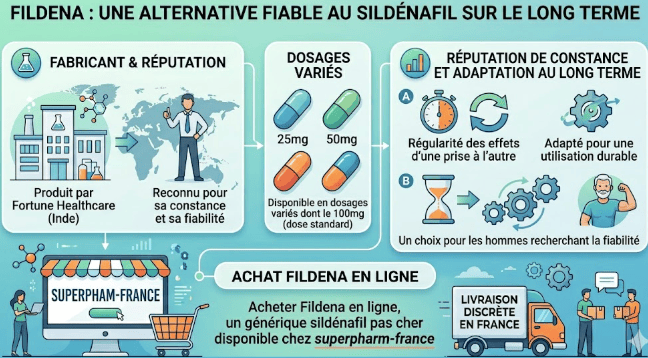 Le Viagra est le médicament le plus connu contre les troubles de l'érection, mais il est soumis à ordonnance en France et son prix en pharmacie reste élevé. Bonne nouvelle : il existe plusieurs alternatives sérieuses et accessibles sans ordonnance, disponibles en ligne à des tarifs bien plus compétitifs. Des génériques comme le Cenforce, le Fildena, le Vigora ou encore le Viagra Super Active contiennent le même principe actif que le Viagra — le Sildénafil — et offrent une efficacité comparable. Le site superpharm-france est aujourd'hui la référence pour trouver ces alternatives et acheter viagra 100mg chez superpharm-france avec la livraison rapide en France.
