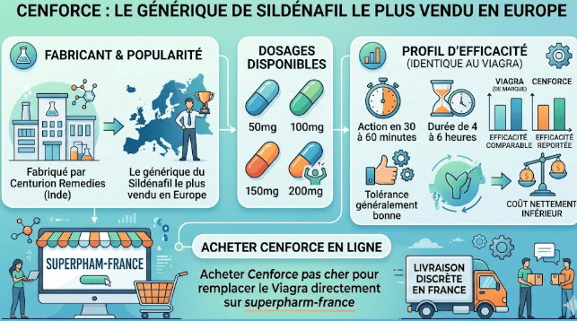 Le Cenforce est fabriqué par le laboratoire indien Centurion Remedies et s'est imposé comme le générique du Sildénafil le plus vendu en Europe. Disponible en plusieurs dosages — 50mg, 100mg, 150mg et 200mg